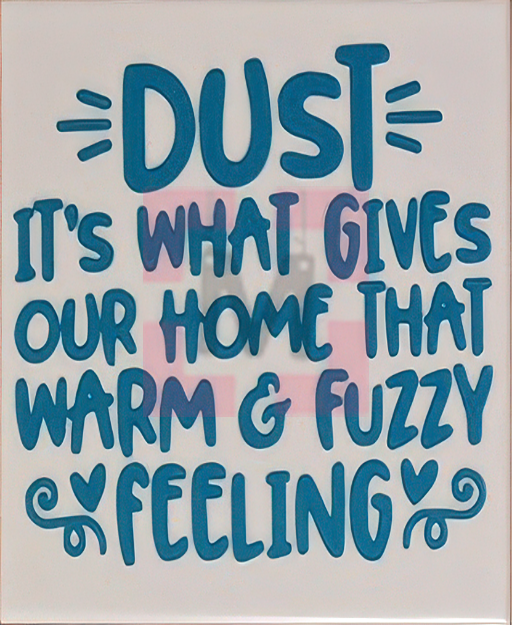 Een witte glanzende tegel van keramiek, formaat 15 x 15 cm, beplakt met blauw vinyl in de tekst ‘Dust,It’s what gives our home a warm and fuzzy feeling’